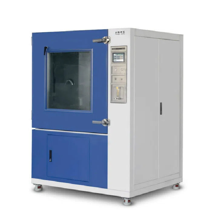 沙尘试验箱学名为“砂尘试验箱”,模拟自然界风沙气候对产品的破坏性,适用于检测产品的外壳密封性能,主要用于外壳防护等级标准中规定的IP5X和IP6X两个等级的试验。设备有载灰尘垂直循环的气流,试验用灰尘可以循环使用 ,整个风道采用进口不锈钢板制作,风道底部与锥形料斗接口连接,风机进出风口直接与风道连接,再在适当的位置上将工作室顶部扩散口接入工作室体,形成“O”型闭式垂直吹尘循环系统,使气流能顺畅地流动,最 大限度的使尘土分散均匀。采用单台大功率低噪音离心风机,根据试验需要用变频调速器来调节风速。